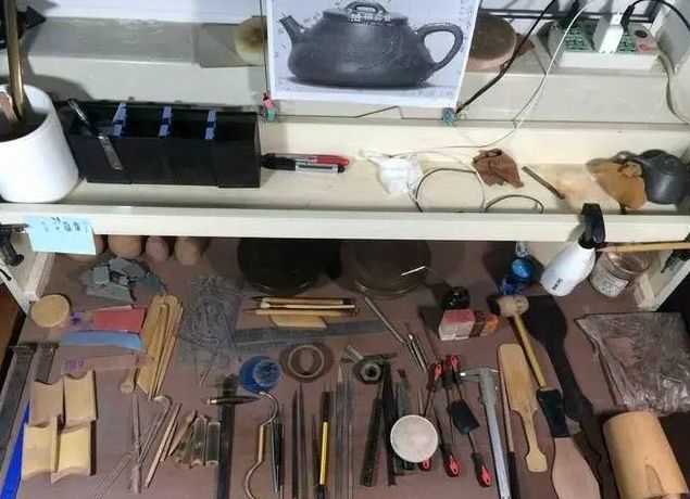 從全手工壺所要使用到的工具可見一斑,琳瑯滿目的工具擺滿工作臺。